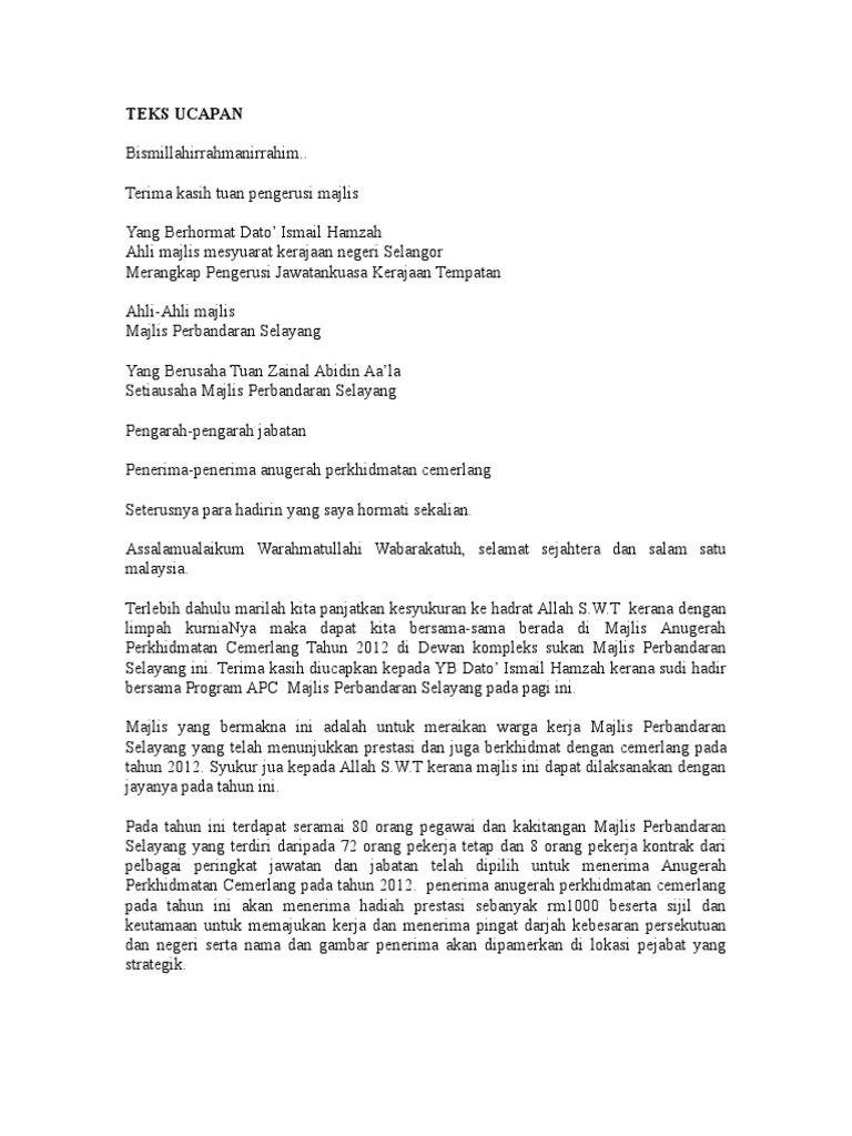 Accountant General S Department Of Malaysia Agd Publication Teks Ucapan Ybhg Datuk Anm Pada Majlis Anugerah Perkhidmatan Cemerlang Apc Tahun 2012 Page 4 from 150.242.182.7 By golden rose 37467 views. Majlis merakamkan ucapan terima kasih kepada ustaz. Jika ada, ianya kebetulan dan takdir semata. Majlis merakamkan ucapan terima kasih kepada. Teks ucapan majlis anugerah kecemerlangan akademik 2014 mp3 & mp4. Teks perasmian mesyuarat agung + anugerah cemerlang. Majlis persaraan pegawai pendidikan merupakan sebahagian tatacara operasi piawai atau s.o.p. Kalau puan pikat kenari jangan patahkan batang jerami kepada puan mandat diberi mohon disempurnakan majlis kami tidak lengkap sekiranya.